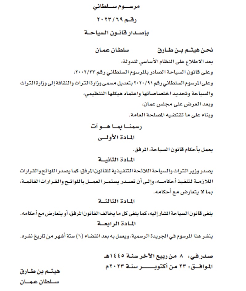 صدر في الثالث والعشرين من أكتوبر عام 2023 المرسوم السلطاني رقم ٦٩ / ٢٠٢٣ بإصدار قانون السياحة، والذي نصّ على أن يعمل بأحكام قانون السياحة، المرفق، وأن يصدر وزير التراث والسياحة اللائحة التنفيذية للقانون المرفق، كما يصدر اللوائح والقرارات اللازمة لتنفيذ أحكامه، وإلى أن تصدر يستمر العمل باللوائح والقرارات القائمة، بما لا يتعارض مع أحكامه.