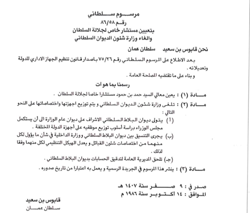 في الرابع عشر من أكتوبر من عام 1986 أصدر السلطان قابوس بن سعيد عددًا من المراسيم السامية من بينها: المرسوم السلطاني رقم 57/86 بتعديل اسم ديوان شؤون البلاط السلطاني ليصبح “ديوان البلاط السلطاني”، والمرسوم السلطاني رقم 58/86 بتعيين معالي السيد حمد بن حمود مستشارًا خاصًا لجلالة السلطان المعظم، وإلغاء وزارة شؤون الديوان السلطاني وتوزيع أجهزتها واختصاصاتها.