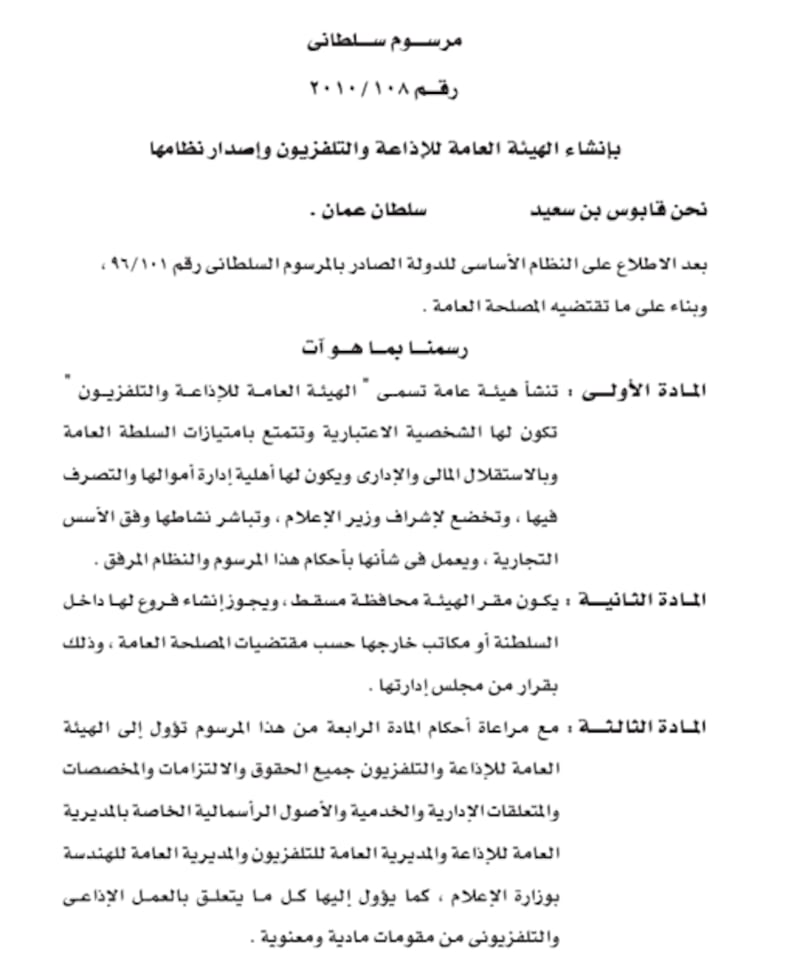 في التاسع عشر من أكتوبر عام 2010 صدر المرسوم السلطاني رقم ١٠٨ / ٢٠١٠ بإنشاء الهيئة العامة للإذاعة والتلفزيون وإصدار نظامها، والذي نصّ على أن تنشأ هيئة عامة تسمى “الهيئة العامة للإذاعة والتلفزيون” تكون لها الشخصية الاعتبارية وتتمتع بامتيازات السلطة العامة وبالاستقلال المالي والإداري ويكون لها أهلية إدارة أموالها والتصرف فيها، وتخضع لإشراف وزير الإعلام، وتباشر نشاطها وفق الأسس التجارية، ويعمل في شأنها بأحكام هذا المرسوم والنظام المرفق.