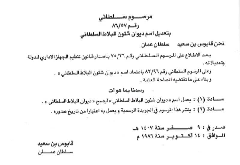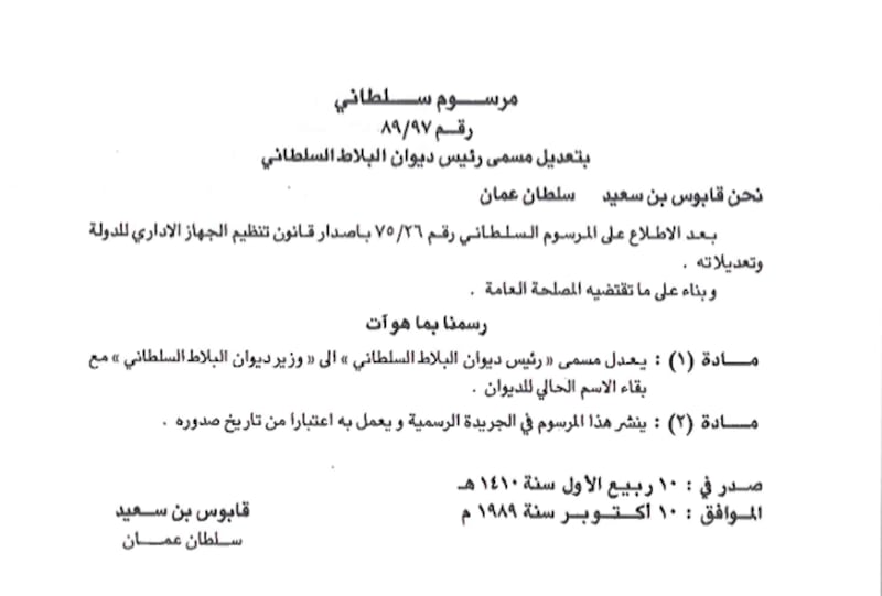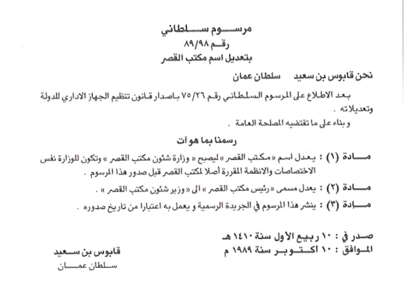 في 10 أكتوبر من عام 1989 أصدر السلطان قابوس بن سعيد خمسة مراسيم سامية هي: المرسوم السلطاني رقم 97/89 بشأن تعديل مسمى رئيس ديوان البلاط السلطاني إلى وزير ديوان البلاط السلطاني مع بقاء الاسم الحالي للديوان، والمرسوم السلطاني رقم 98/89 بشأن تعديل اسم “مكتب القصر” ليصبح “وزارة شؤون مكتب القصر”، ويعدل مسمى " رئيس مكتب القصر" إلى وزير شؤون مكتب القصر“.
