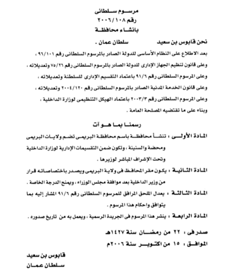 صدر في الخامس عشر من أكتوبر 2006، المرسوم السلطاني رقم ١٠٨ / ٢٠٠٦ القاضي بإنشاء محافظة باسم محافظة البريمي تضم ولايات البريمي ومحضة والسنينة، وتكون ضمن التقسيمات الإدارية لوزارة الداخلية وتحت الإشراف المباشر لوزيرها، ويكون مقر المحافظ في ولاية البريمي ويصدر باختصاصاته قرار من وزير الداخلية بعد موافقة مجلس الوزراء، ويمنح الدرجة الخاصة.