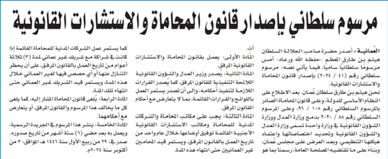 ونص المرسوم على أنه يجب على مكاتب المحاماة والشركات المدنية للمحاماة ومكاتب الاستشارات القانونية الأجنبية القائمة توفيق أوضاعها خلال عام واحد من تاريخ العمل بالقانون المرفق، ويستمر قيد المحامين غير العمانيين حتى انتهاء هذه المدة، كما يستمر عمل الشركات المدنية للمحاماة القائمة إذا كانت في شراكة مع شريك غير عماني لمدة (٣) ثلاثة أعوام من تاريخ العمل بالقانون المرفق، على أن يحظر التنازل عنها أو أي حصص فيها لغير العماني خلال هذه المدة، ويستمر قيد الشريك غير العماني حتى انتهاء تلك المدة.