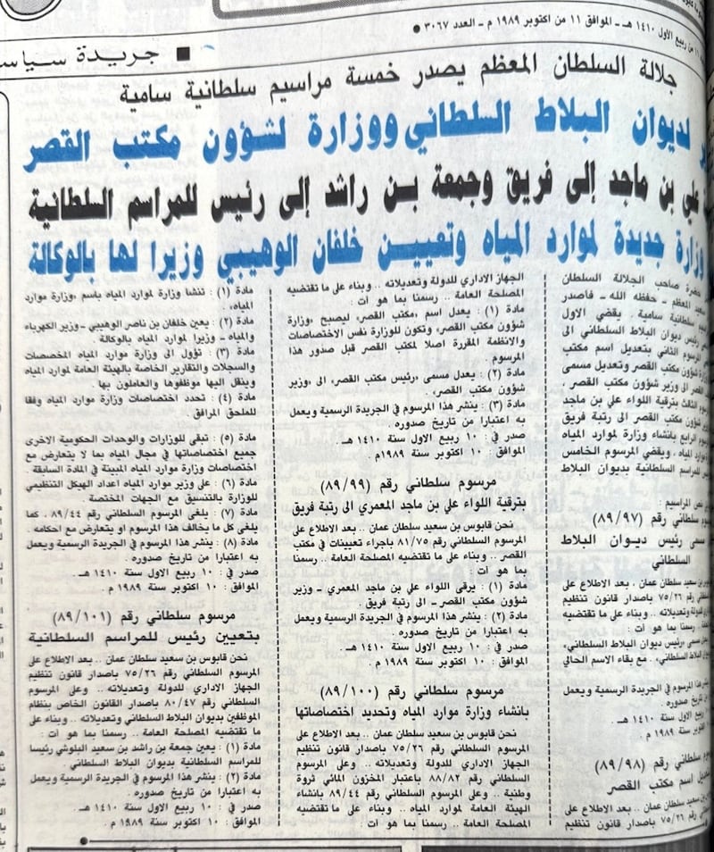 والمرسوم السلطاني رقم 99/89 بشأن ترقية اللواء علي بن ماجد المعمري وزير شؤون مكتب القصر إلى رتبة فريق، والمرسوم السلطاني رقم 100/89 بشأن إنشاء وزارة جديدة باسم “وزارة موارد المياه”، وتحديد اختصاصاتها لتشمل كل ما يتعلق بشؤون المياه في السلطنة، وتعيين خلفان بن ناصر الوهيبي وزيرًا لموارد المياه بالوكالة، إلى جانب منصبه الآخر كوزير للكهرباء والمياه، والمرسوم السلطاني رقم 101/89 بشأن تعيين جمعة بن راشد بن سعيد البلوشي رئيسًا للمراسم السلطانية.