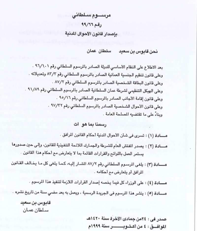 في الرابع من أكتوبر 1999 صدر المرسوم السلطاني رقم ٦٦ / ٩٩ بإصدار قانون الأحوال المدنية، وتكون من خمسة مواد مختلفة.
