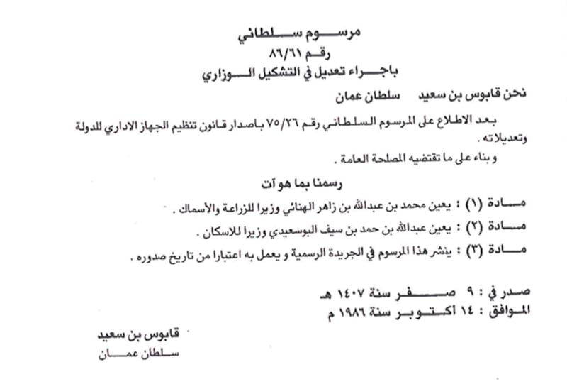 والمرسوم السلطاني رقم 61/86 بتعيين محمد بن عبدالله بن زاهر الهنائي وزيرًا للزراعة والأسماك، وبتعيين عبدالله بن حمد بن سيف البوسعيدي وزيرًا للإسكان.
