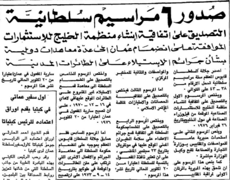 في أكتوبر من عام 1976 أصدر السلطان قابوس طيّب الله ثراه ستة مراسيم سلطانية من بينها: التصديق على اتفاقية إنشاء منظمة الخليج للاستثمارات، والموافقة على انضمام عمان إلى عدّة معاهدات دوليّة بشأن جرائم الاستيلاء على الطائرات المدنية، واستحداث مديرية عامة للمواصفات والمقاييس بوزارة التجارة والصناعة، والتصديق على اتفاقية الحصانات والامتيازات لمنظمة المؤتمر الإسلامي.