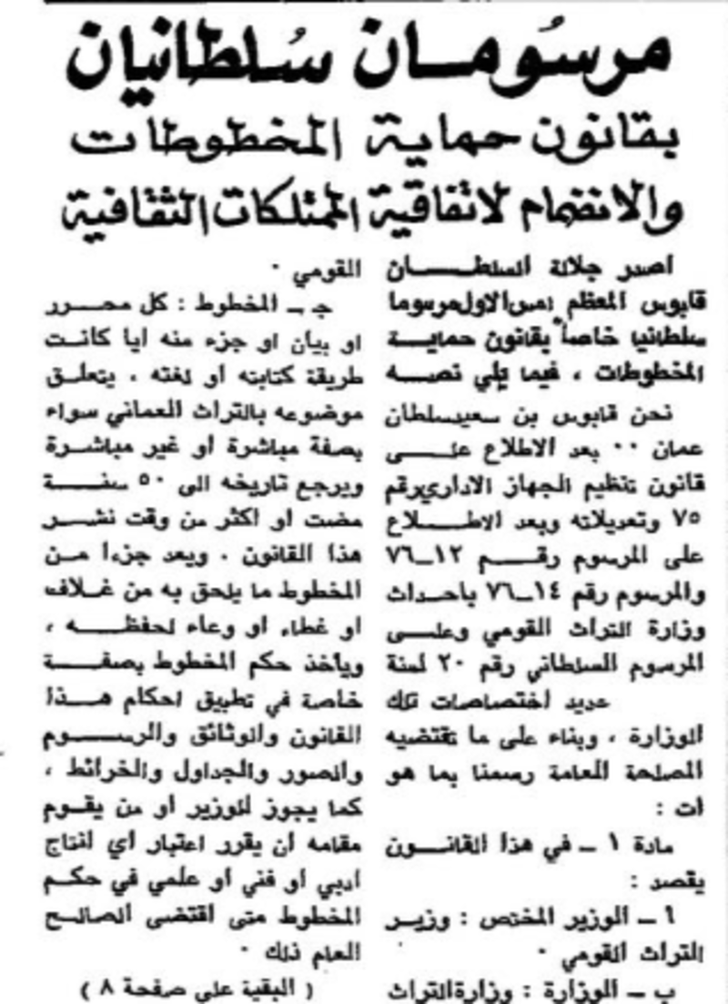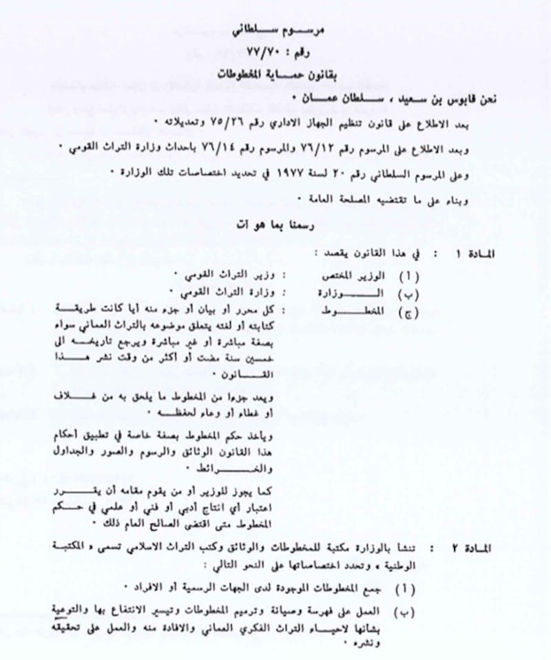 صدر في السابع والعشرين من أكتوبر 1977 المرسوم السلطاني رقم ٧٠ / ٧٧ القاضي بإصدار قانون حماية المخطوطات، وكان من ضمن بنوده إنشاء مكتبة للمخطوطات والوثائق وكتب التراث الإسلامي تسمى “المكتبة الوطنية”.