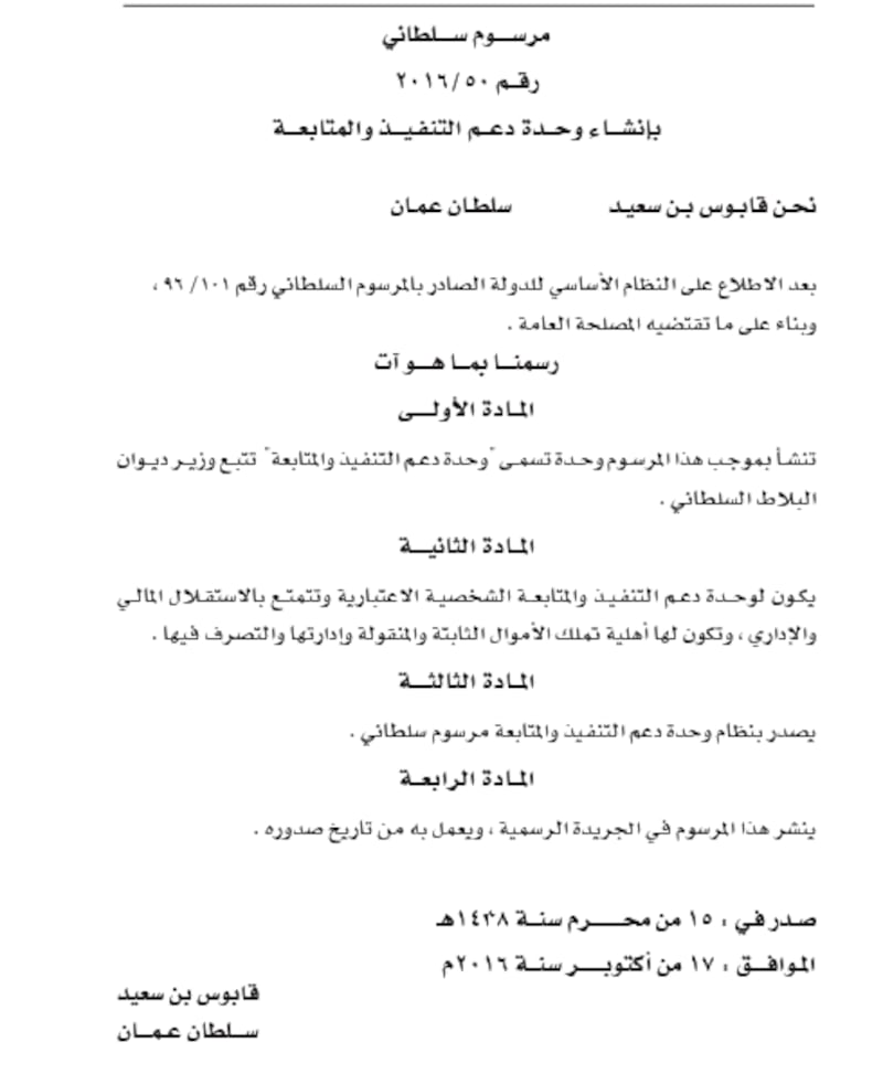في السابع عشر من أكتوبر عام 2016 صدر المرسوم السلطاني رقم ٥٠ / ٢٠١٦ بإنشاء وحدة دعم التنفيذ والمتابعة، حيث تنشأ بموجب هذا المرسوم وحدة تسمى “وحدة دعم التنفيذ والمتابعة” تتبع وزير ديوان البلاط السلطاني، ويكون لوحدة دعم التنفيذ والمتابعة الشخصية الاعتبارية، وتتمتع بالاستقلال المالي والإداري، وتكون لها أهلية تملك الأموال الثابتة والمنقولة وإدارتها والتصرف فيها.