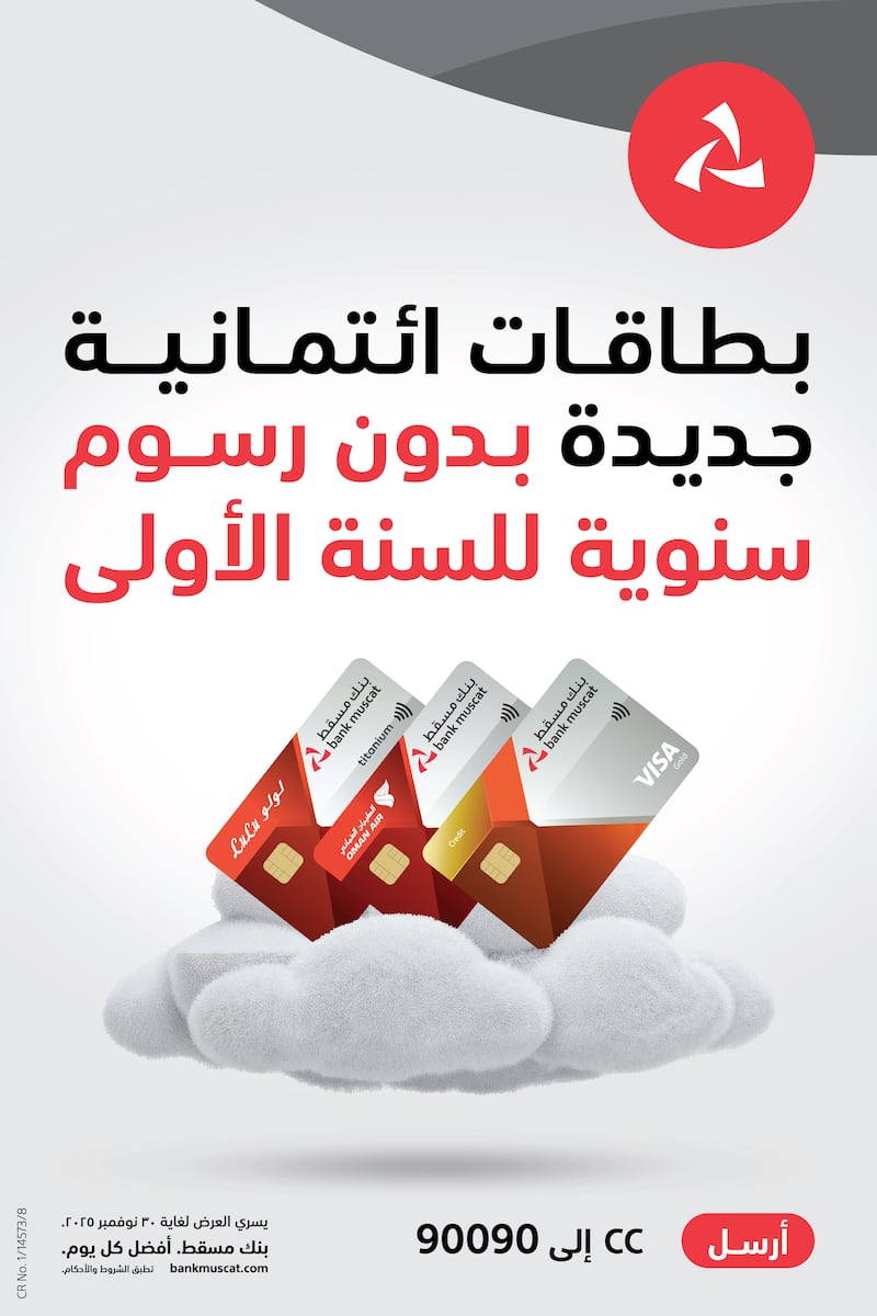 تشكل خدمات البطاقات البنكية الائتمانية من بنك مسقط خيارًا مثاليًا للزبائن كونها تقدم خيارات متعددة تتناسب مع اختلاف الاحتياجات منها ما يناسب العمل أو السفر أو التسوق أو تلبية الاحتياجات الشخصية، وفي هذا الإطار وتزامنًا مع الاحتفالات باليوم الوطني، أعلن بنك مسقط، المؤسسة المالية الرائدة في سلطنة عُمان، عن تقديم عرض خاص يشمل إعفاءً من رسوم السنة الأولى السنوية على بطاقة بنك مسقط والطيران العُماني البلاتينية الائتمانية والبطاقة الائتمانية الذهبية وبطاقة لولو وبنك مسقط الائتمانية.