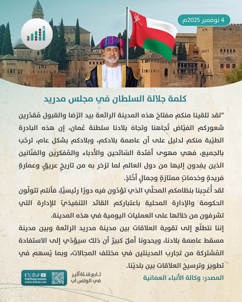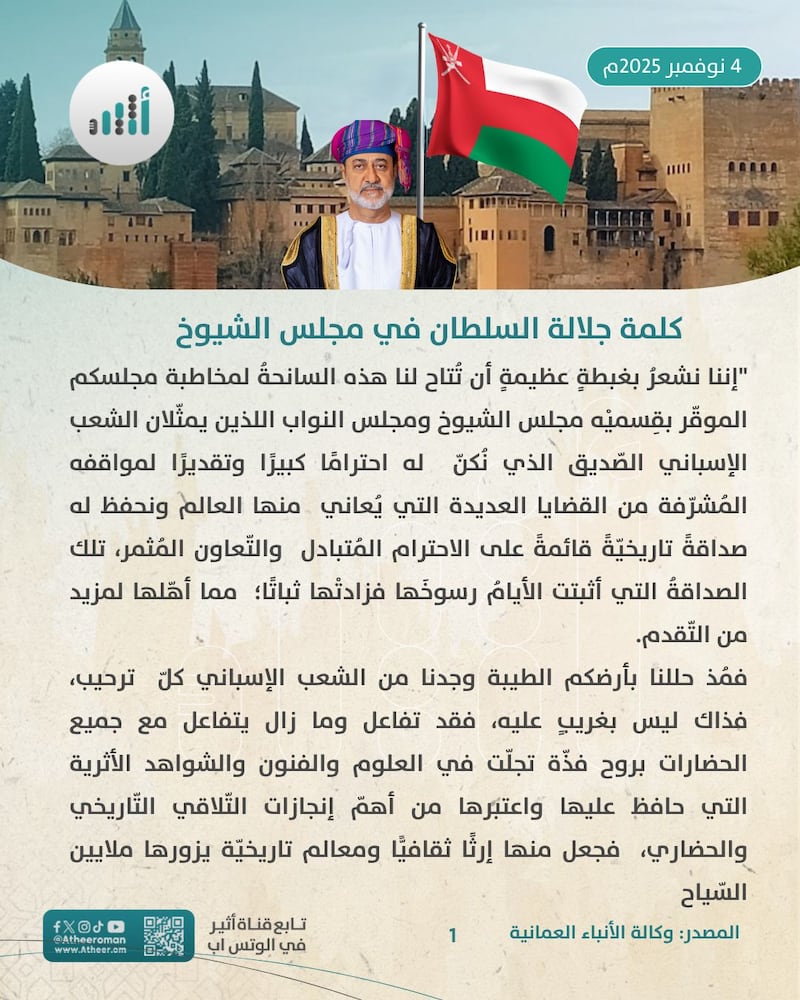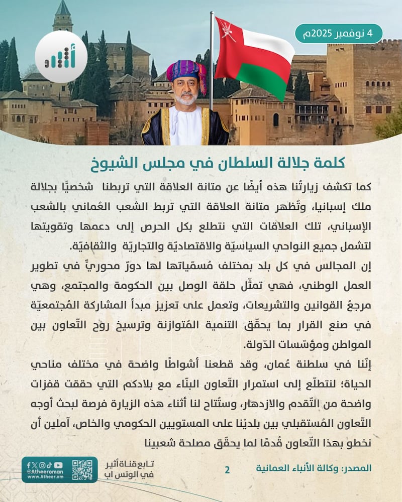 غادر حضرة صاحب الجلالة السُّلطان هيثم بن طارق المعظم -حفظهُ اللهُ ورعاهُ مملكة إسبانيا الصديقة، بعد زيارة “دولة” استغرقت ثلاثة أيام، تلبية للدّعوة الكريمة التي تلقّاها جلالته من جلالة الملك فيليبي السادس ملك مملكة إسبانيا وتعزيزًا لروابط الصداقة بين سلطنة عُمان ومملكة إسبانيا الصديقة بما يسهم في تحقيق تطلعات البلدين؛ سيقوم بمشيئة الله تعالى وتوفيقه - عاهل البلاد المفدى بزيارة دولة إلى مملكة إسبانيا وذلك من تاريخ الثالث إلى الخامس من شهر نوفمبر لعام ٢٠٢٥م.