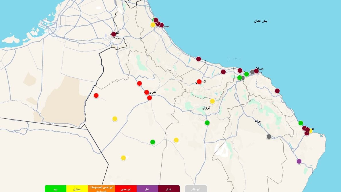 وأظهرت نتائج الرصد ارتفاعًا ملحوظًا في تراكيز الجسيمات العالقة، خصوصًا في محافظات شمال وجنوب الباطنة وبعض ولايات الداخلية، في حين بقيت المناطق الجنوبية مستقرة نسبيًا.