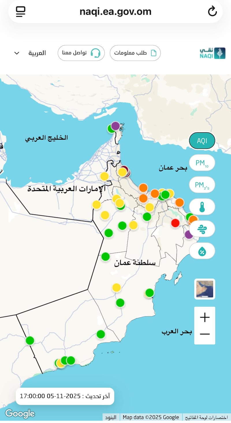 شهدت سلطنة عمان منذ يوم أمس موجة غبار واسعة النطاق أثرت في مستويات جودة الهواء في عدد من المحافظات؛ ما استدعى متابعة دقيقة من قبل هيئة البيئة عبر “المنصة الوطنية لمؤشرات جودة الهواء” لرصد مؤشرات التلوث في مختلف المناطق.