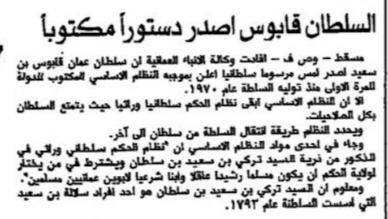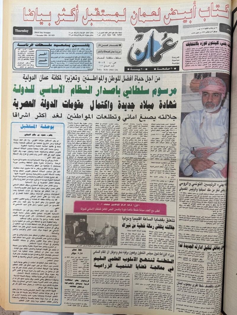 في السادس من نوفمبر عام 1996، شهدت سلطنة عُمان حدثًا سياسيًا مهمًا من أبرز محطّاتها التاريخيّة، تمثّل في صدور النظام الأساسي للدولة، المعروف باسم الكتاب الأبيض، في خطوةٍ جسّدت ترسيخ مفهوم دولة المؤسسات، وتعزيز مسيرة بناء الدولة العصرية.
