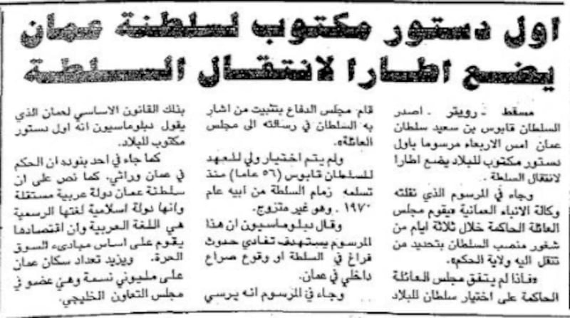 كما أفردت العديد من الصحف العربية مساحات خاصة للحديث عن التجربة العُمانية المتميزة في بناء دولة المؤسسات، مشيرةً إلى ما يمثّله هذا النظام من نقلة نوعية في مسيرة الدولة الحديثة بقيادة السلطان قابوس بن سعيد، وقد عكست التغطيات الإعلامية آنذاك ما شكّله صدور النظام الأساسي من منعطفٍ تاريخي يؤسس لمرحلةٍ جديدةٍ من العمل المؤسسي والشفافية في عُمان، ويؤكد التزامها بنهج التطوير المتدرّج والمتوازن في مسيرتها الوطنية.