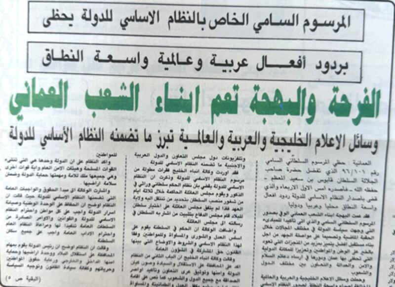 حظي صدور النظام الأساسي للدولة في السادس من نوفمبر عام 1996م باهتمامٍ واسع من وسائل الإعلام والصحافة المحلية والعربية، نظرًا لأهمية هذا الحدث في التاريخ السياسي العُماني، فقد تناولت الصحف الوطنية، وفي مقدمتها جريدة عُمان وجريدة الوطن، مضامين النظام الجديد بالتحليل والعرض، مبرزةً دوره في ترسيخ مبادئ العدالة والمساواة، وتنظيم العلاقة بين الحاكم والمحكوم على أسسٍ قانونية واضحة.