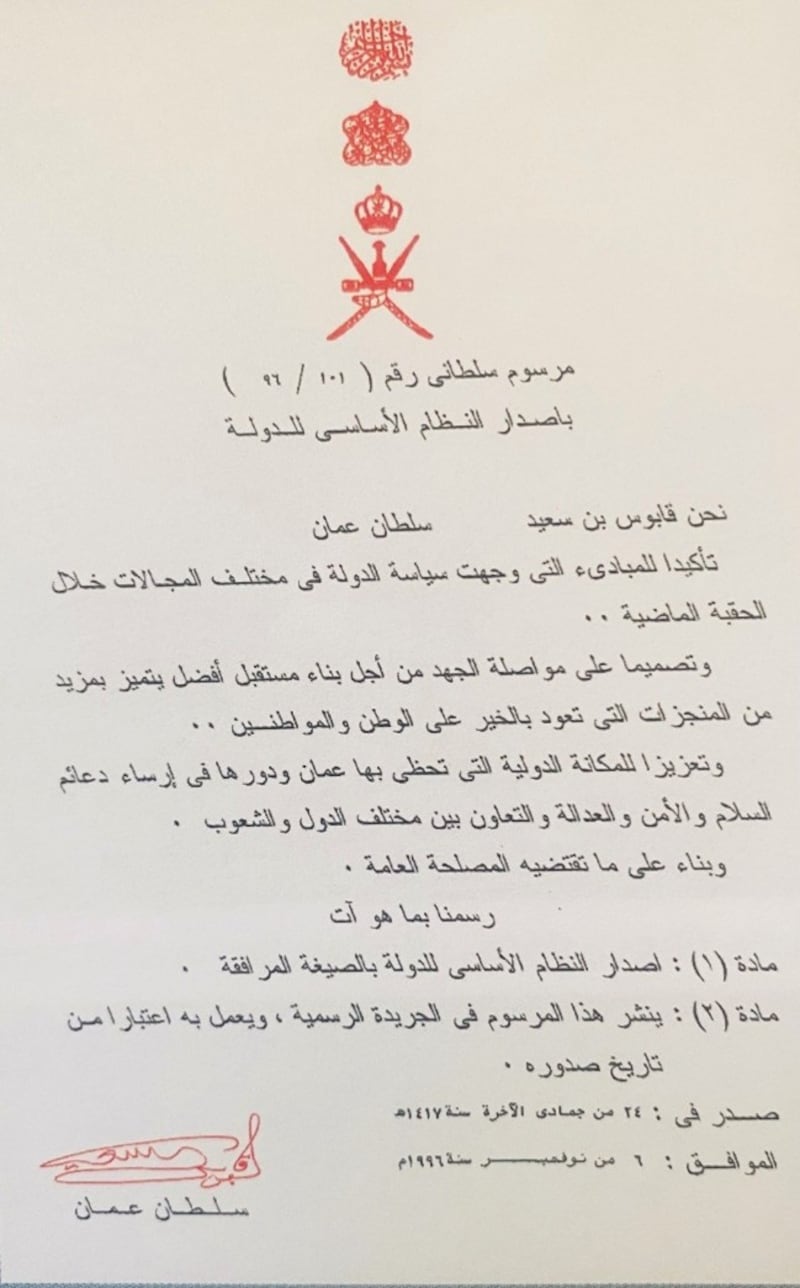 يُذكر أن حضرة صاحب الجلالة السلطان هيثم بن طارق المعظم -حفظه الله ورعاه- قد أصدر في 11 يناير 2021م المرسوم السلطاني رقم ٦ / ٢٠٢١ الذي قضى بإصدار النظام الأساسي للدولة؛ تأكيدا للمبادئ التي قامت عليها سلطنة عمان، ووجهت سياستها في مختلف المجالات، ونهضت بها: محليا، وإقليميا، ودوليا، وترسيخا لمكانة عمان الدولية، ودورها في إرساء أسس العدالة، ودعائم الحق والأمن والاستقرار والسلام بين مختلف الدول والشعوب، وتصميما على مواصلة الجهود لصياغة مستقبل أفضل، يتسم بمزيد من الإنجازات التي تعود بالخير على الوطن، والمواطنين، واستمرارا لمشاركة أبناء الوطن، وتمكينهم من صنع مستقبلهم في جميع مناحي الحياة، وصونا للوطن، وحفاظا على أرضه، ووحدته، ونسيجه الاجتماعي، وحماية لمقوماته الحضارية، وتعزيزا للحقوق، والواجبات، والحريات العامة، ودعما لمؤسسات الدولة، وترسيخا لمبادئ الشورى.