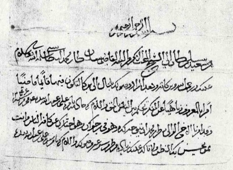 تتضمن الوثيقة رسالة موجهة من السيد سعيد بن سلطان، الذي حكم عمان خلال الفترة من 1806م إلى 1856م، إلى الشيخ العالِم سلطان بن محمد بن صلت البطاشي، في 4 محرم 1246هـ الموافق 25 يونيو 1830م.