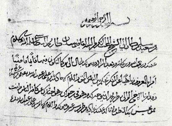" من سعيد بن سلطان إلى الشيخ المحب الأكرم الثقة القاضي سلطان بن محمد البطاشي سلّمه الله تعالى.