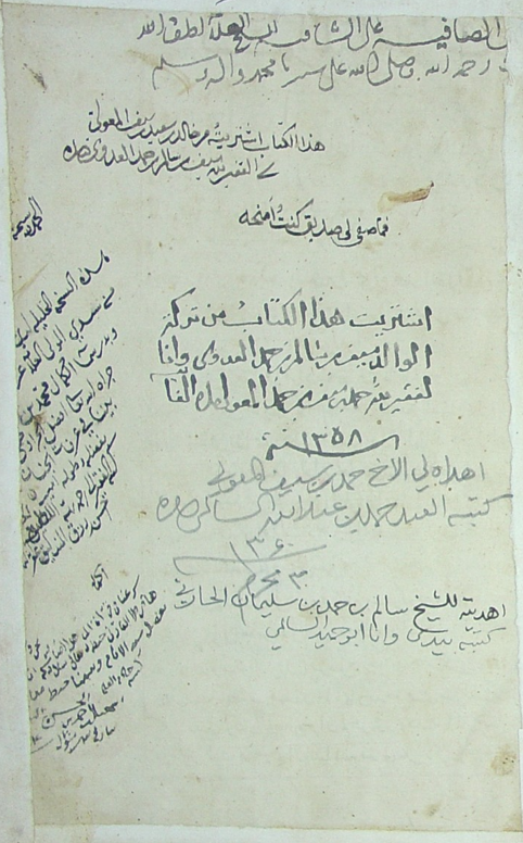 - “هذا الكتاب اشتريته من خالد بن سعيد بن سيف المعولي. الفقير لله سيف بن سالم بن حمد العدوي”.