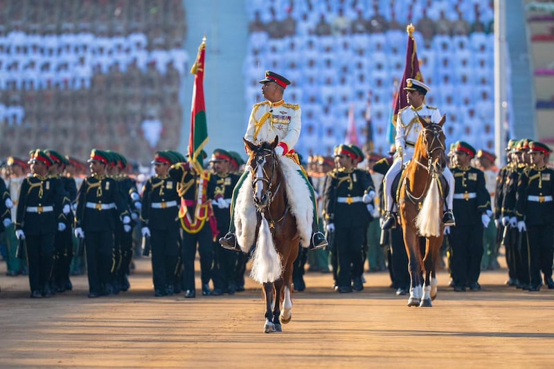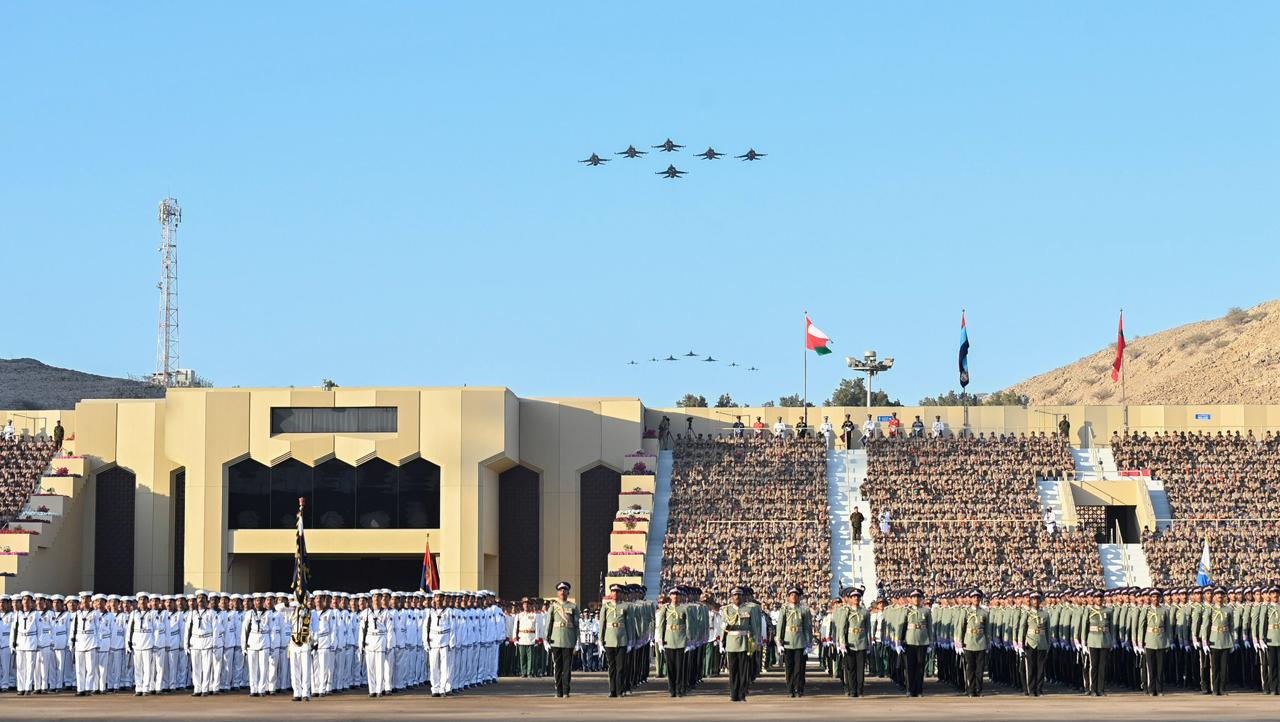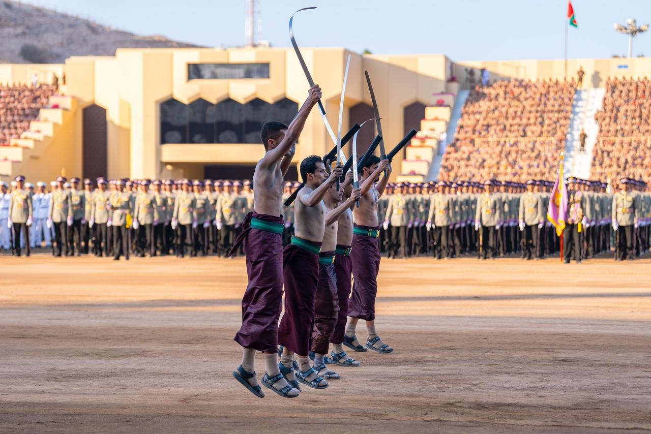 وخُتُمت مراسمُ الاستعراض العسكريّ المَهيب بأداء طابور الاستعراض للنشيد العسكريَّ (فلْتسلَمي عُمان)، وترديد نداء الولاء والتّأييد “الإيمان بالله، الولاء للسُّلطان، الذود عن الوطن”، ثم الهتاف ثلاثًا بحيـاة حضرةِ صاحبِ الجلالةِ السُّلطان هيثم بن طارق المعظّم القائدِ الأعلى حفظهُ اللهُ ورعاهُ.