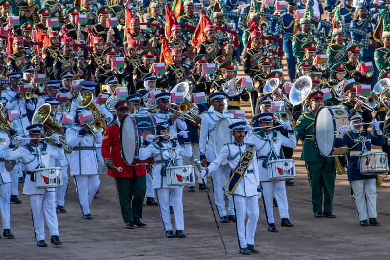 وقدّمت الفرقُ الموسيقيّة العسكريّة المُشتركة التي تمثّل أسلحة قوات السُّلطان المسلّحة، والحرس السُّلطانيّ العُمانيّ، وشرطة عُمان السُّلطانيّة، وشؤون البلاط السُّلطاني استعراضها الموسيقيّ بالمسير البطيء والعاديّ مرورًا من أمام المقصورة السُّلطانيّة، مُؤدّيةً التّحيّةَ العسكريّة لجلالةِ القائد الأعلى -أيّدهُ اللهُ-.