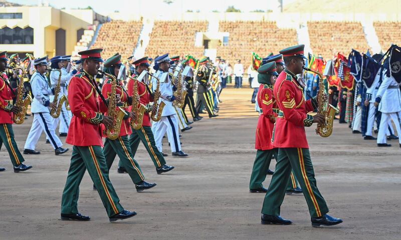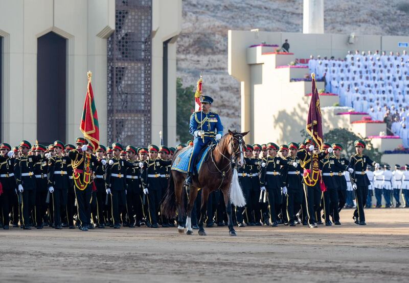 ثم قدّمت طوابيرُ حرس المراسم استعراضَها العسكريَّ بمصاحبة المقطوعات الموسيقيّة للموسيقى العسكريّة المُشتركة، مؤدّيةً التحيّةَ العسكريّة لجلالةِ القائد الأعلى.
