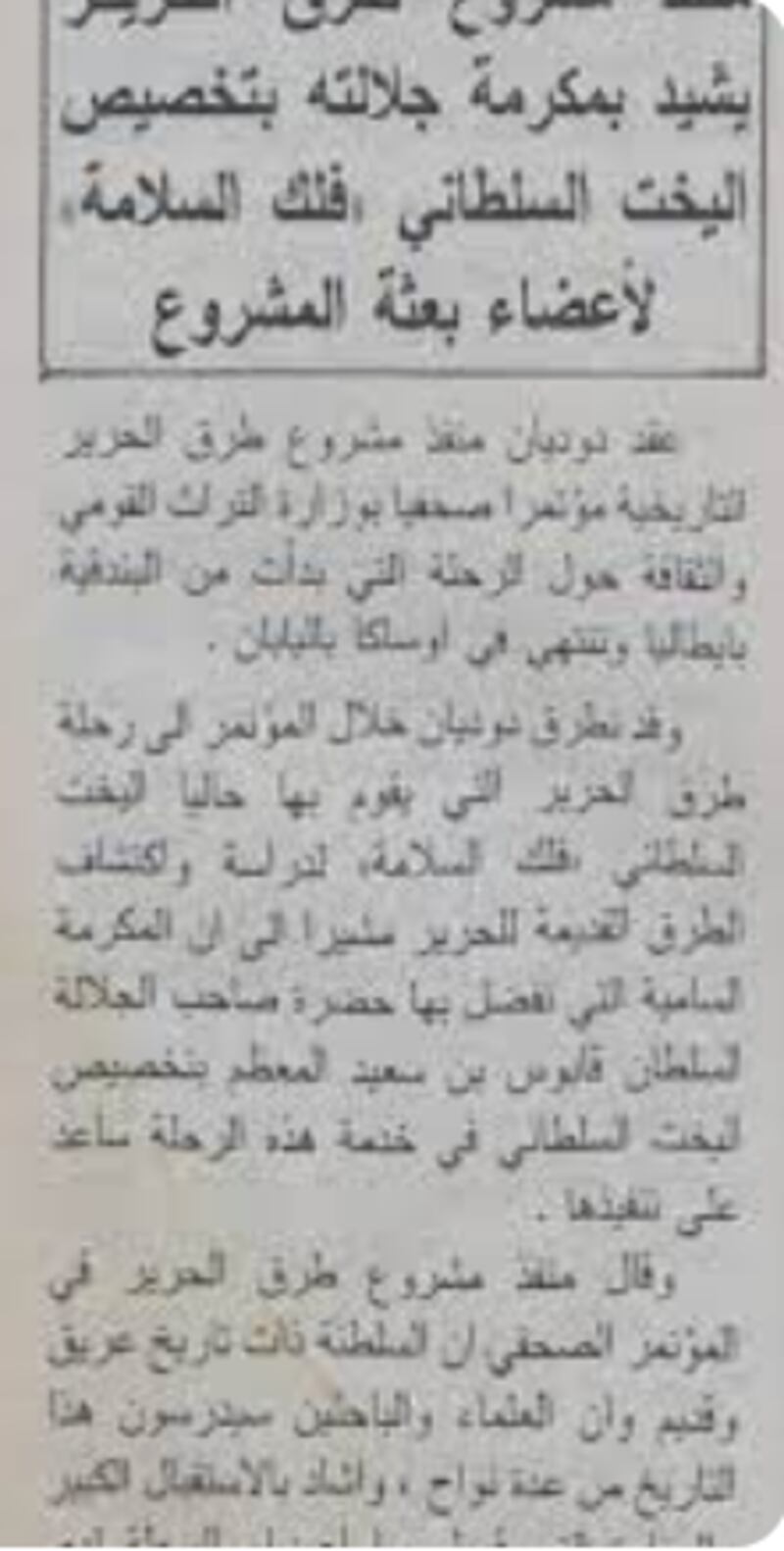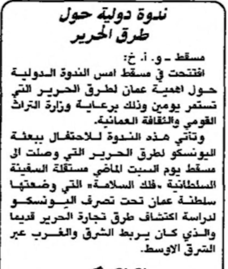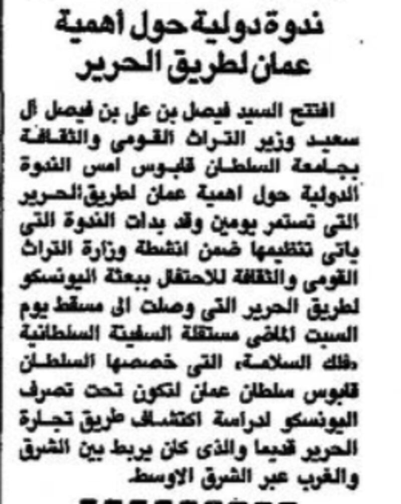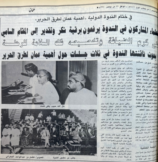 في يوم الثلاثاء الموافق 20 نوفمبر 1990م، شهدت قاعة المحاضرات الكبرى بجامعة السلطان قابوس فعالية علمية متميزة تمثّلت في عقد ندوة من الندوات التاريخية المهمة التي احتضنتها الجامعة، وقد خُصِّصت هذه الندوة لمناقشة موضوع ذي بعد حضاري وتاريخي عميق، حمل عنوان “أهمية عُمان بالنسبة لطرق الحرير”.