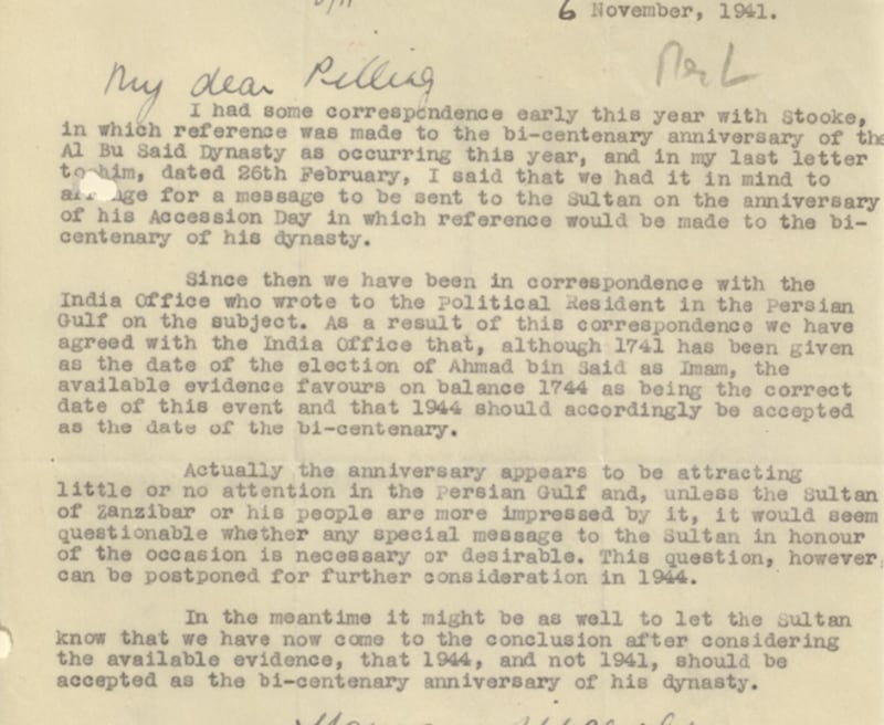 وفي 6 نوفمبر 1941م وضمن وثائق ومراسلات الملف السابق، أرسل أحد المسؤولين البريطانيين إلى زميل له يُدعى Pilling، رسالة داخلية يدور موضوعها حول تحديد السنة الصحيحة للاحتفال بالذكرى المئوية الثانية (200 عام) لتأسيس أسرة آل بوسعيد الحاكمة في عُمان: