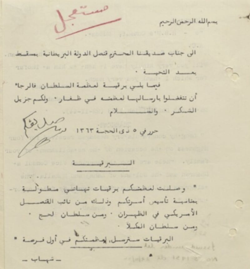 " بالإشارة إلى برقيتي رقم 20135 بتاريخ 9 سبتمبر، يجري النظر حاليًا في مسألة إرسال رسالة تهنئة من الملك إلى سلطان زنجبار.