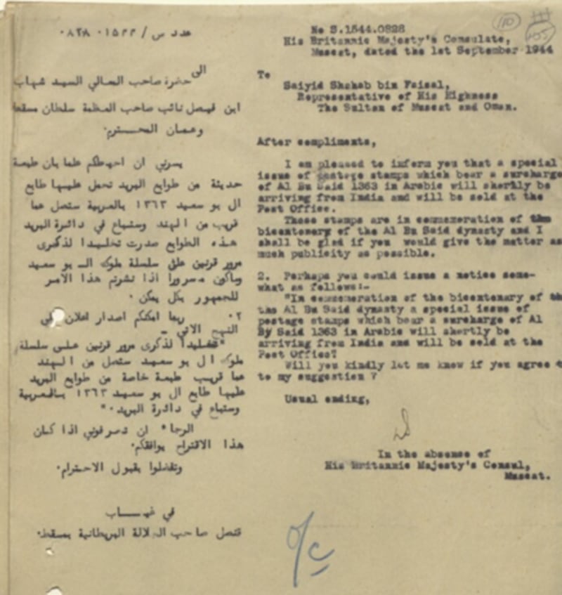 وفي سبتمبر 1944م بعثت القنصلية البريطانية في مسقط بخطاب إلى ناظر الشؤون الخارجية ونائب السلطان وقتها، تمت الإشارة فيه إلى قرب وصول طبعة حديثة من طوابع البريد تحمل عليها طابع البوسعيد 1363 بالعربية تخليدًا لذكرى مرور قرنين على سلسلة ملوك البوسعيد.