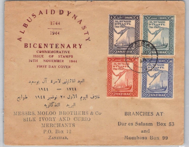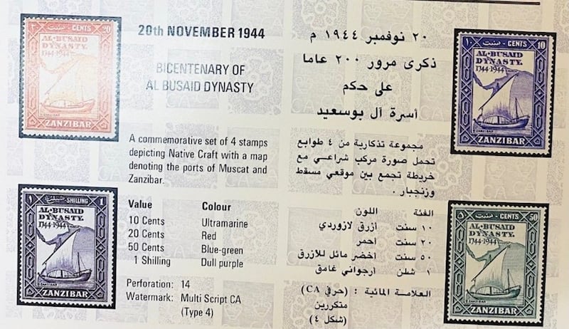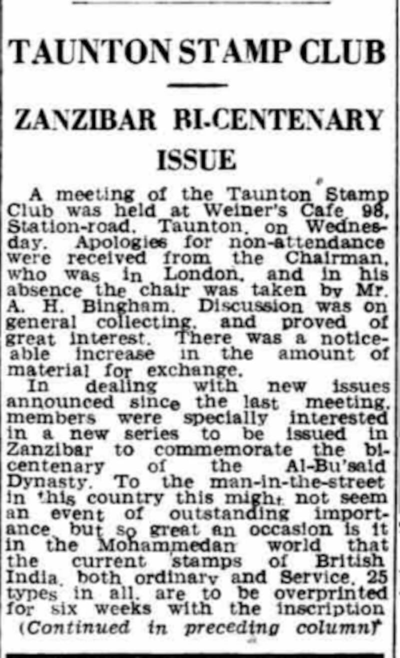 ونشرت صحيفة Taunton Courier and Western Advertiser في عددها الصادر يوم السبت 25 نوفمبر 1944 أنه عُقد اجتماع لنادي الطوابع في تونتون في مقهى وينر بشارع ستيشن رقم 98 يوم الأربعاء، وقد أبدى الأعضاء اهتمامًا خاصًا بسلسلة جديدة من الطوابع ستصدر في زنجبار للاحتفال بمرور مئتي عام على حكم أسرة آل بوسعيد.