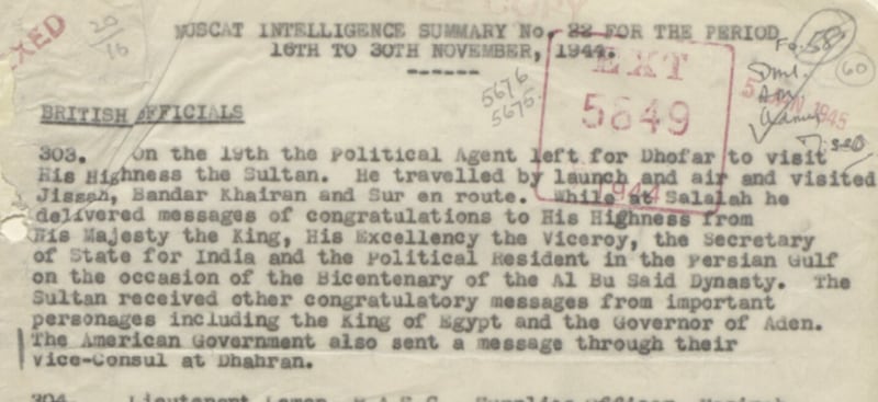 وهناك خطاب رسمي بريطاني مؤرخ في عام 1944م موجه إلى شخص يُدعى Harrison (هاريسون)، يتناول نقاشًا بين المسؤولين البريطانيين حول إرسال رسالة تهنئة من الملك البريطاني إلى سلطان زنجبار بمناسبة الاحتفال بمرور مئتي عام على تأسيس أسرة آل بوسعيد، مع التساؤل عما إذا كان من المناسب إرسال رسالة مماثلة إلى سلطان مسقط أيضًا: