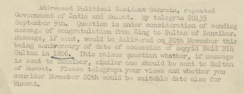 في الواقع، يبدو أن هذه الذكرى لا تحظى باهتمام كبير في الخليج الفارسي، ما لم يُبدِ سلطان زنجبار أو رعاياه اهتمامًا خاصًا بها، ولذلك، فإن إرسال رسالة تهنئة خاصة للسلطان بهذه المناسبة قد لا يكون ضروريًا أو ذا أهمية تُذكر، ومع ذلك، يمكن تأجيل النظر في هذا الأمر إلى عام 1944.