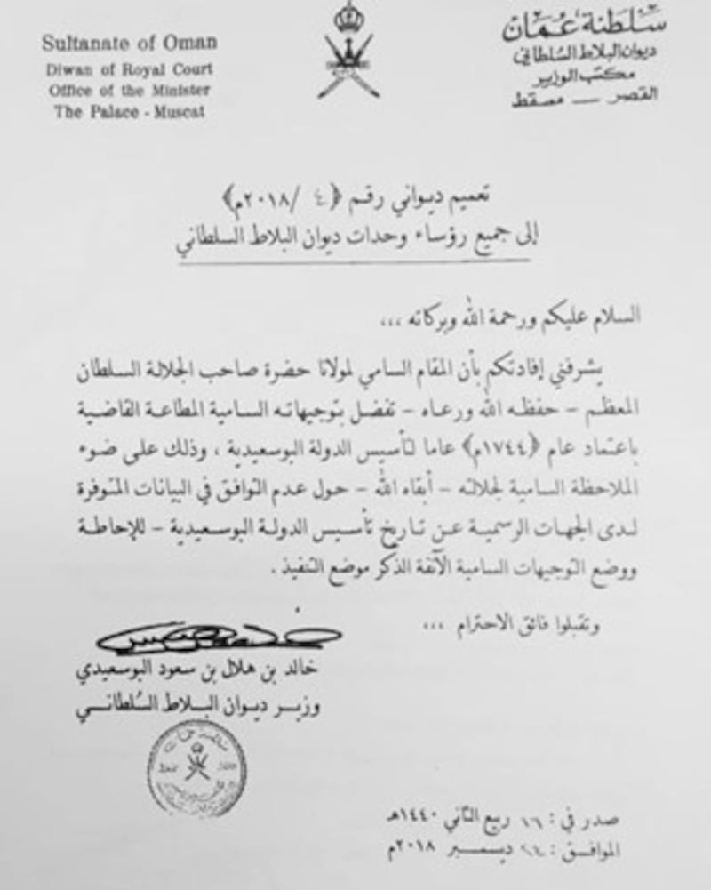 وفي 24 ديسمبر 2018م صدر تعميمٌ من قبل معالي السيد خالد بن هلال البوسعيدي وزير ديوان البلاط السلطاني يشير إلى أن “المقام السامي لمولانا حضرة صاحب الجلالة السلطان المعظم – حفظه الله ورعاه – تفضل فأصدر توجيهاته السامية المطاعة القاضية باعتماد عام 1744م عامًا لتأسيس الدولة البوسعيدية، وذلك على ضوء الملاحظة السامية لجلالته – أبقاه الله – حول عدم التوافق في البيانات المتوفرة لدى الجهات الرسمية عن تاريخ تأسيس الدولة البوسعيدية”.