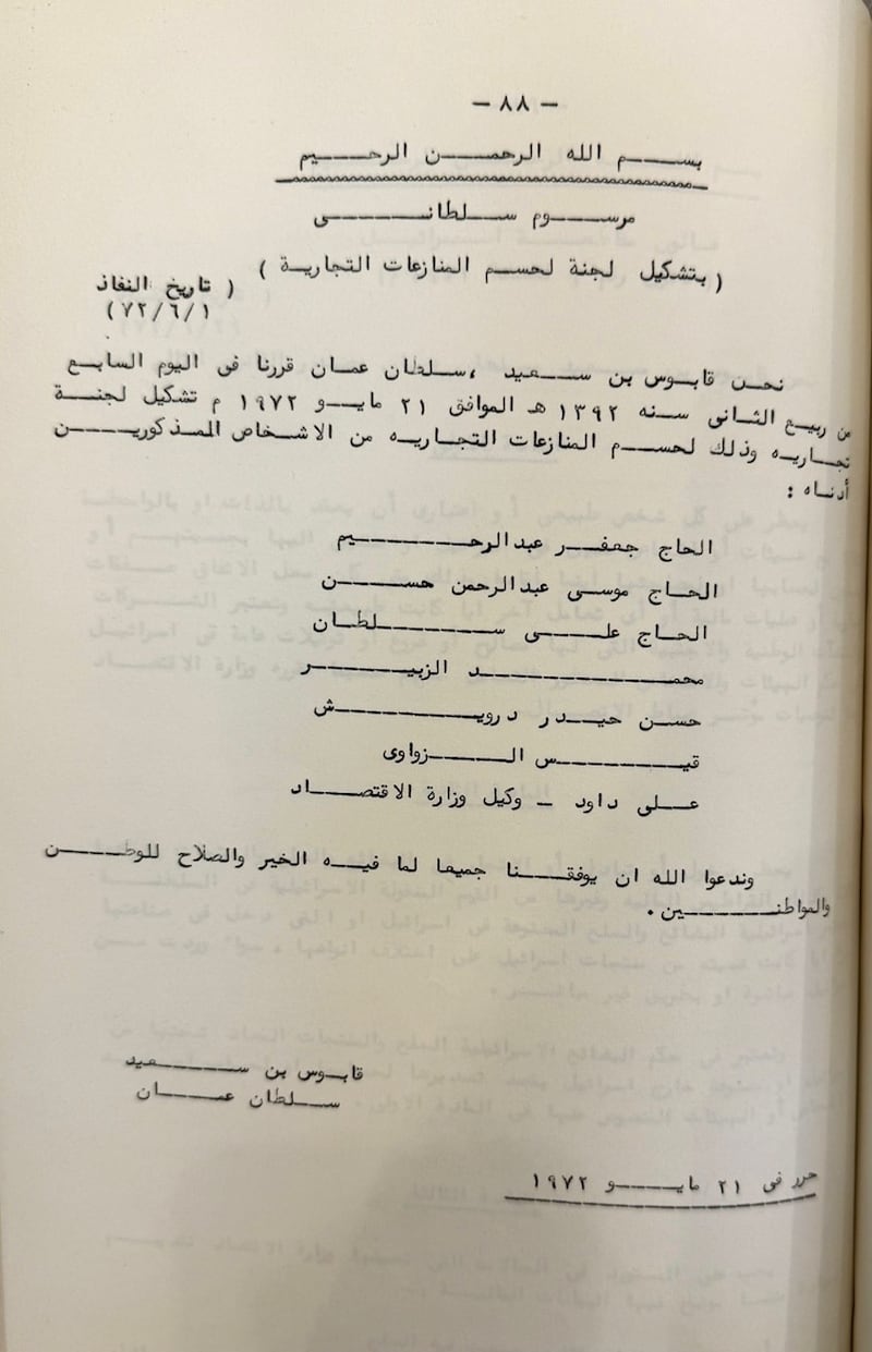 صدر المرسوم السلطاني في سلطنة عُمان بتاريخ 21 مايو 1972م، وبدأ نفاذه ابتداءً من الأول من يونيو 1972م، وقد اشتمل المرسوم على مادة واحدة نصّت على تشكيل لجنة تجارية مختصة بحسم المنازعات التجارية، وتألفت اللجنة من الأعضاء: الحاج جعفر عبد الرحيم، والحاج موسى عبد الرحمن حسن، والحاج علي سلطان، ومحمد الزبير، وحسن حيدر درويش، وقيس الزواوي، وعلي داود، ووكيل وزارة الاقتصاد.