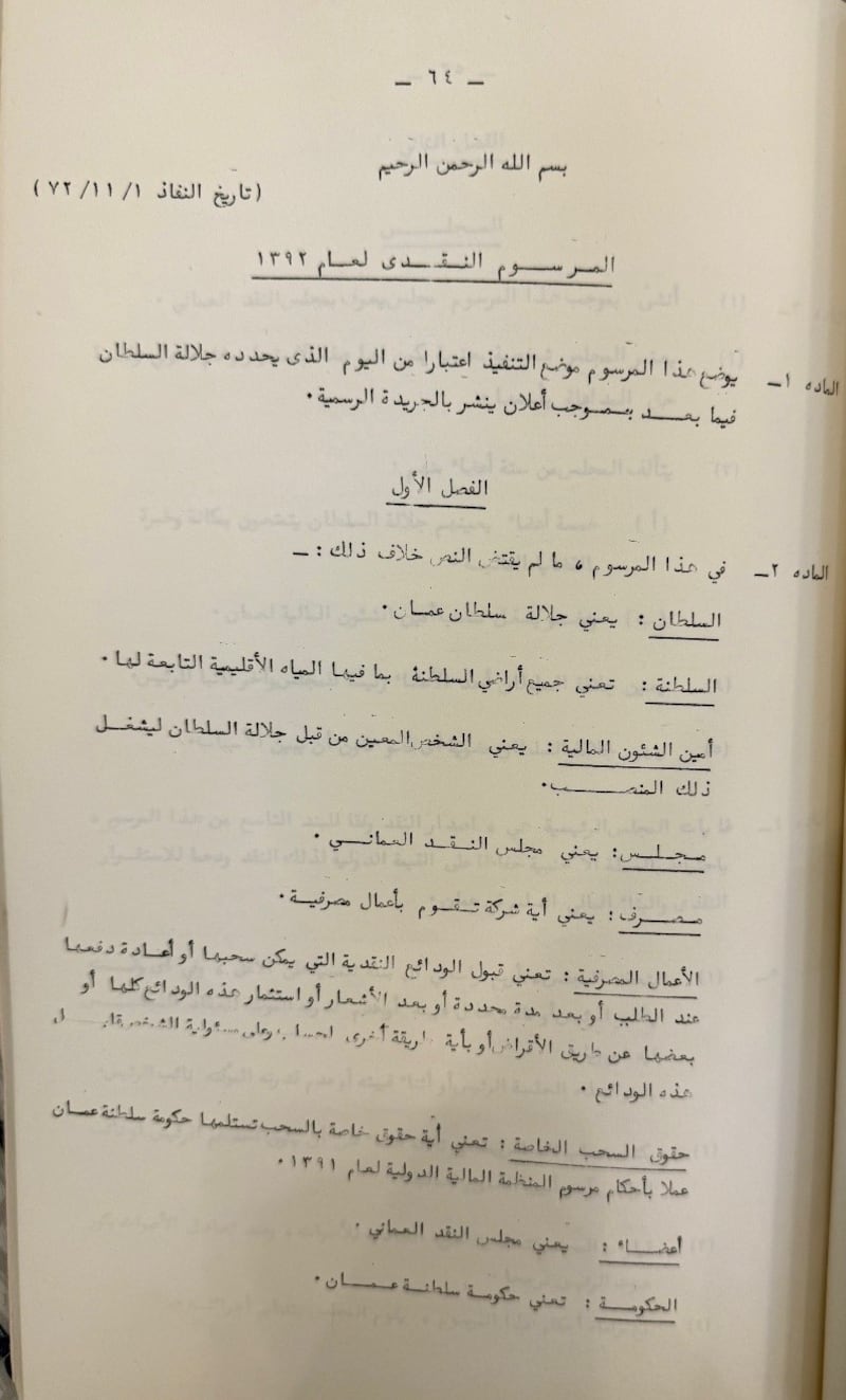 صدر المرسوم النقدي لعام 1392هـ في عام 1972م، وجاء بوصفه أحد أهم التشريعات المالية التي شهدتها سلطنة عُمان في بدايات مرحلة التأسيس الاقتصادي الحديث، وقد بدأ العمل بأحكامه ابتداءً من الأول من نوفمبر 1972م، وتكوّن من سبعة فصول اشتملت على اثنتين وثلاثين مادة تناولت تنظيم النظام النقدي العُماني، وإدارة العملة، والرقابة على التداول المالي.