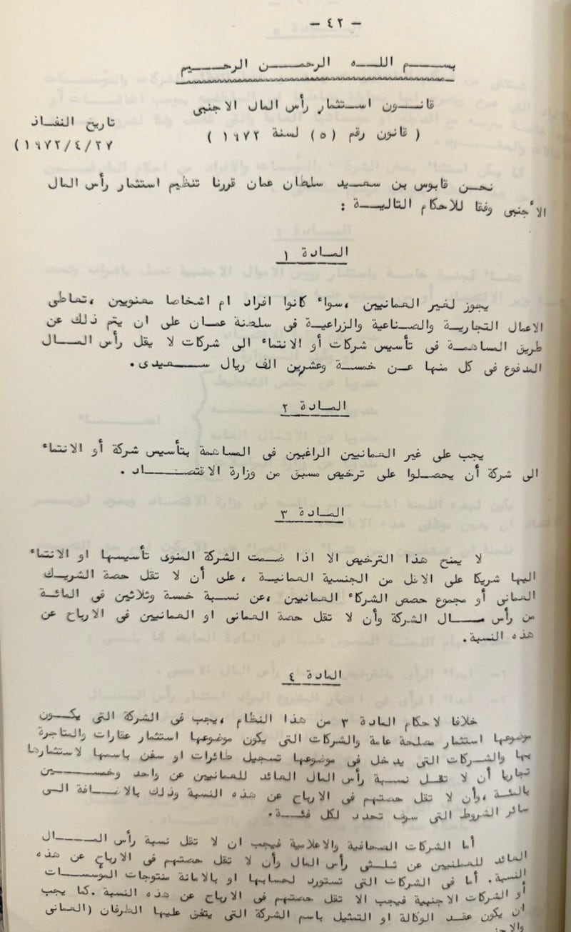 صدر قانون استثمار رأس المال الأجنبي في شهر مارس 1972م في إطار توجه الدولة المبكر نحو الانفتاح الاقتصادي وجذب الاستثمارات للإسهام في بناء الهياكل الأساسية للاقتصاد الوطني، وقد بدأ العمل بأحكامه ابتداءً من 27 أبريل 1972م، وجاء في خمس عشرة مادة تناولت الضوابط المنظمة لدخول الاستثمارات الأجنبية إلى السلطنة وشروط مزاولة الأنشطة الاقتصادية.