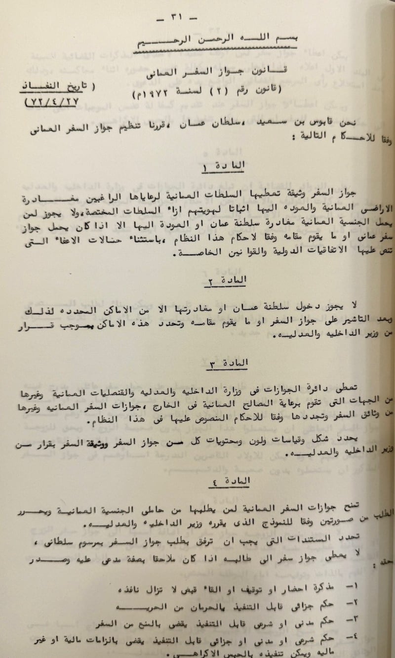 يحمل هذا المرسوم السلطاني رقم (31/1971)، وقد صدر في مسقط بتاريخ 25 صفر 1391هـ الموافق 22 أبريل 1971، ويتكون من ثماني مواد مختلفة.