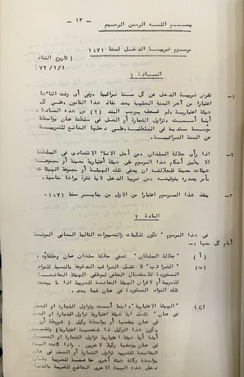 ويُعدّ هذا التشريع أول إطار قانوني منظّم لفرض ضريبة الدخل في سلطنة عمان، وهو ما يعكس توجه الدولة نحو تطوير مواردها المالية وتنويع مصادر الإيرادات، ومن خلال مواد المرسوم الأربع عشرة، وُضعت قواعد واضحة تحدد حقوق الإدارة الضريبية وواجبات المكلفين، في خطوة هدفت إلى بناء منظومة مالية مستقرة.