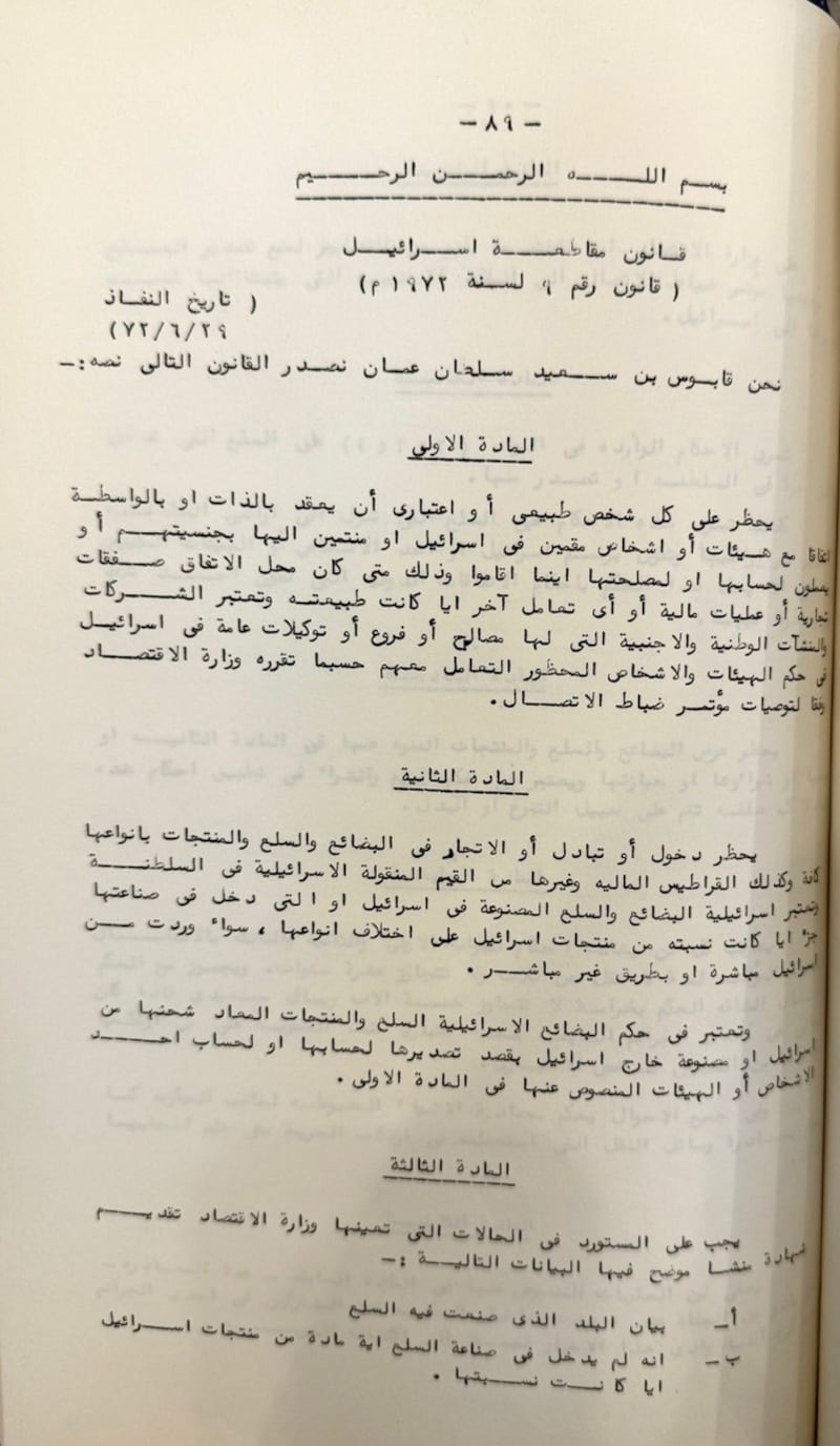 صدر قانون مقاطعة إسرائيل في سلطنة عُمان بتاريخ 9 جمادى الأول 1392هـ الموافق 21 يونيو 1972م، وبدأ سريان نفاذ مواده ابتداءً من 29 يونيو 1972م، وقد تضمن القانون ثلاث عشرة مادة تناولت أسس ومجالات المقاطعة، وحقوق الدولة وواجبات الجهات العامة والخاصة في تطبيقها.