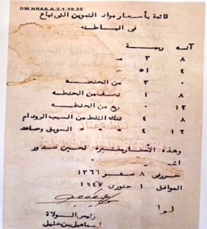 كما نطالع في إحدى الوثائق المؤرخة بالأول من يناير 1947م قائمةً تفصيلية بأسعار مواد التموين التي كانت تباع في منطقة الباطنة آنذاك، وتشمل أسعار الحنطة بمختلف أوزانها، إضافةً إلى أسعار عددٍ من المشتقات النفطية الضرورية للحياة اليومية.