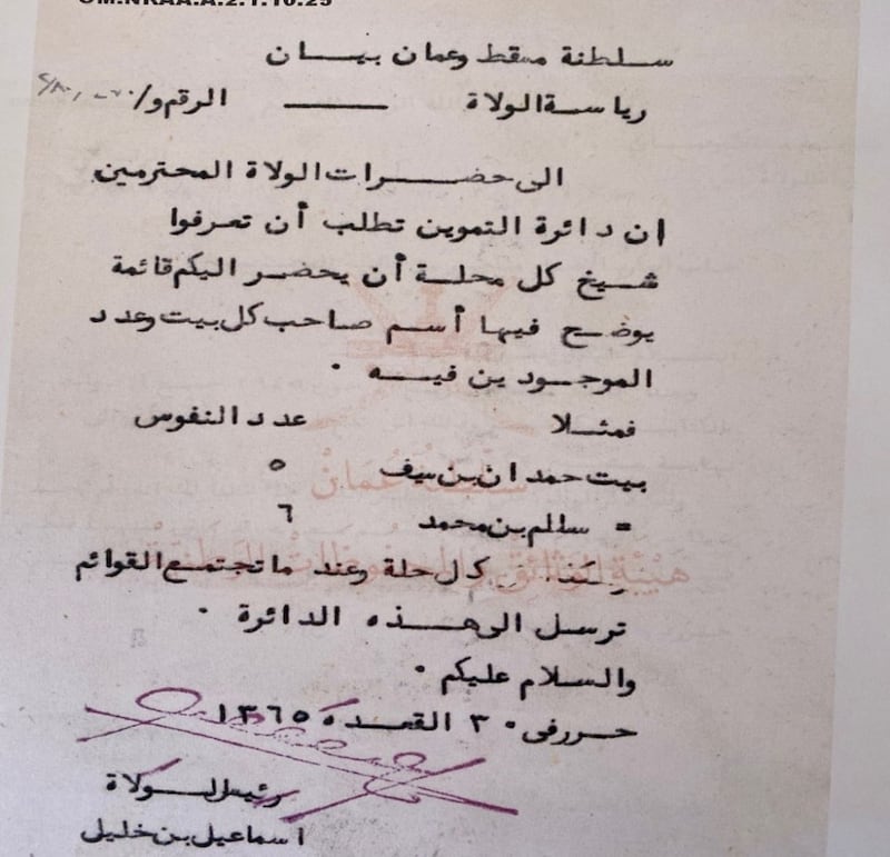 ومن بين الوثائق ذات الدلالة الإدارية والاقتصادية، يبرز خطاب موجَّه بتاريخ 3 ذي القعدة 1365هـ الموافق 29 سبتمبر 1946م من رئاسة الولاة إلى جميع الولاة الخاضعين لسلطتها، يتعلّق برغبة دائرة التموين في الحصول على قوائم دقيقة بالبيوت الموجودة في محلات (حارات) الولايات، إلى جانب عدد أفراد كل أسرة.