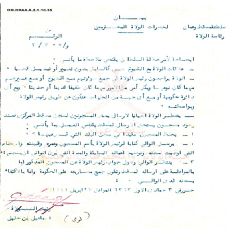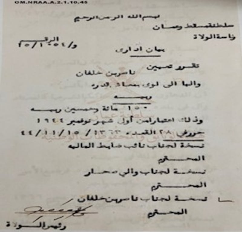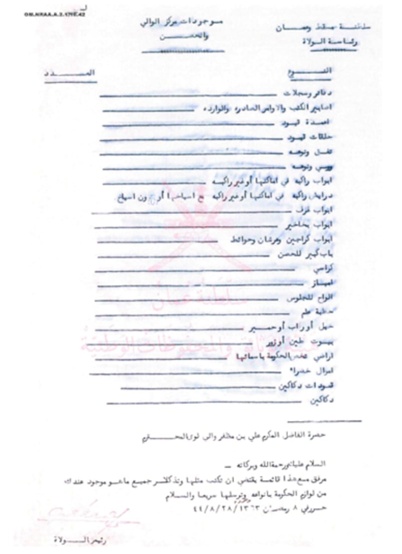 وتُعد هذه الوثيقة من المصادر النادرة التي تساعد الباحث على فهم البيئة المادية والتنظيمية للإدارة التقليدية في عمان خلال منتصف القرن العشرين، بما تقدمه من تفاصيل دقيقة عن طبيعة التجهيزات التي اعتمدت عليها مراكز الولاة يومذاك.