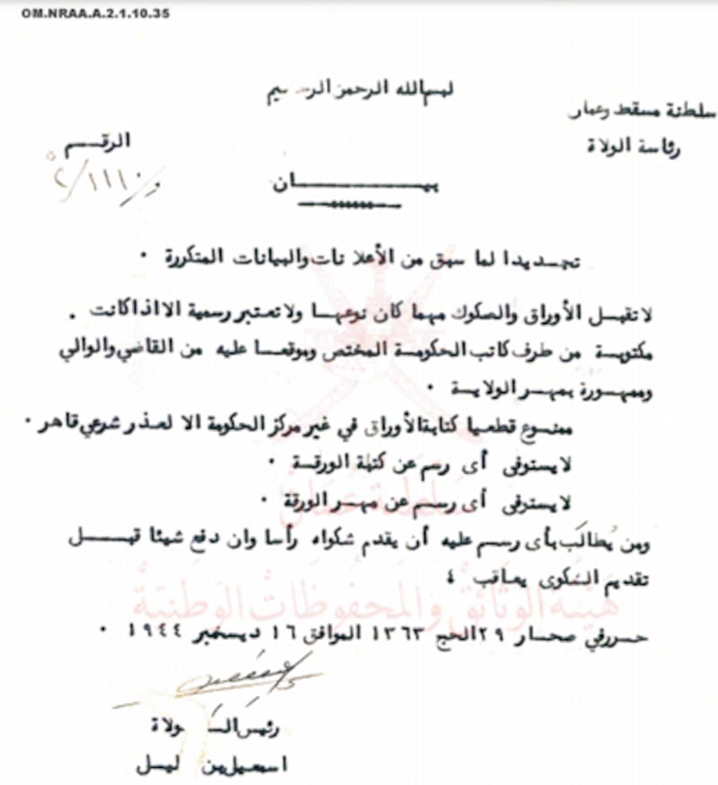 وتقترب “أثير” في هذا التقرير من بعض أوراق الدفاتر الإدارية التي تعود إلى الفترة التي تولّى فيها الوالي إسماعيل بن خليل الرصاصي رئاسة الولاة في عُمان، وذلك منذ نحو عام 1944م، للكشف عن جانب من ملامح التنظيم الإداري وأساليب التوثيق المتّبعة آنذاك.