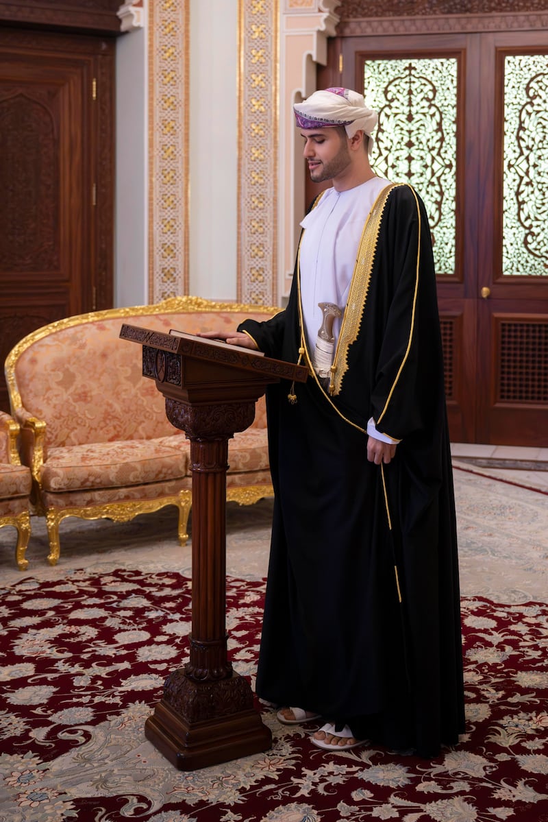 “أقسم بالله العظيم أن أكون مخلصا لسلطاني وبلادي، وأن أحترم النظام الأساسي للدولة وقوانينها النافذة، وأن أحافظ محافظة تامة على كيانها وسلامة أراضيها، وأن أرعى مصالحها ومصالح مواطنيها رعاية كاملة، وأن أؤدي واجباتي بالصدق والأمانة”.