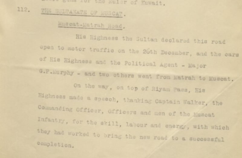 وتعزّز الوثائق البريطانية هذا التسلسل الزمني؛ إذ يرد خطاب من G. P. Murphy (الميجر ميرفي، القنصل/الوكيل السياسي البريطاني في مسقط) موجَّه إلى السلطان تيمور بن فيصل بتاريخ 25 ربيع الثاني 1346هـ الموافق 22 أكتوبر 1927م، يشير فيه صراحةً إلى أن ”الطريق ما بين مسقط ومطرح هو قريب الاختتام“، وهو ما يدل على أن أعمال شق الطريق كانت قد بلغت مراحلها النهائية قبل الافتتاح الرسمي بنحو عامين.