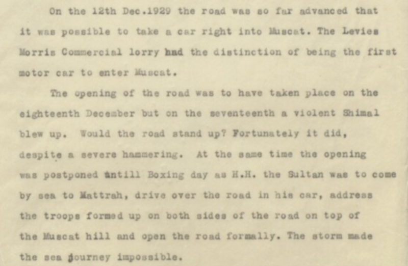 وفي الملف ”مسقط: اتصالات حول إنشاء الطرق“ المنشور ضمن ملفات مكتبة قطر الرقمية هناك فقرة تشير إلى أنه ومع تقدّم الأعمال، بلغ الطريق مرحلة تشغيلية بحلول 12 ديسمبر 1929م، حيث أصبح بالإمكان لأول مرة إدخال سيارة آلية مباشرة إلى مسقط، وسُجّل دخول أول مركبة كاختبار عملي لجهوزية الطريق قبل افتتاحه الرسمي، وقد حازت شاحنة تجارية من نوع موريس على شرف كونها أول مركبة آلية تدخل مسقط.