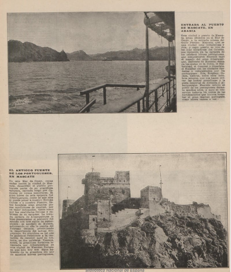 وهناك رحلة المبشرين الإسبانيين بيدرو بايز وانطونيو مونسيرات من الهند إلى الحبشة مروراً بهرمز ومسقط وأسرهما في ظفار سنة 1590م كما وردت في مذكرات المبشر الإسباني بيدرو بايز. كما قام الدبلوماسي الإسباني غارسيا دي سيلفا إي فيغيروا بالتوقف في مسقط في طريق رحلته إلى فارس، وذلك في 19 أبريل 1617م، حيث مكث فيها عدة أيام سمحت له بزيارة المدينة والتعرف على معالمها، وكان ذلك خلال فترة الاحتلال البرتغالي لسواحل عمان، ووصف كنيسة سان أوغستين، وكروم العنب القريبة منها، وأشجار النخيل.