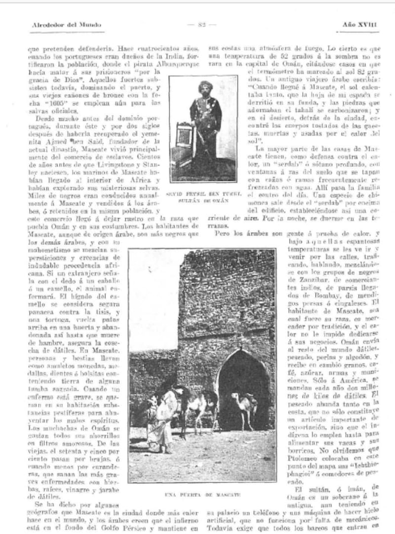 وفي 11 أبريل 1907م تلقى السلطان فيصل بن تركي خطابًا من القنصل الفرنسي في مسقط المسيو لارونس، يشير فيه إلى وصول كتاب (خطاب) من دولة إسبانيا وعلى رأسهم الملك الفونسو الثالث عشر يقدمون فيه الشكر لجلالة السلطان على الصور الخاصة بمسقط التي تم إرسالها سابقًا.