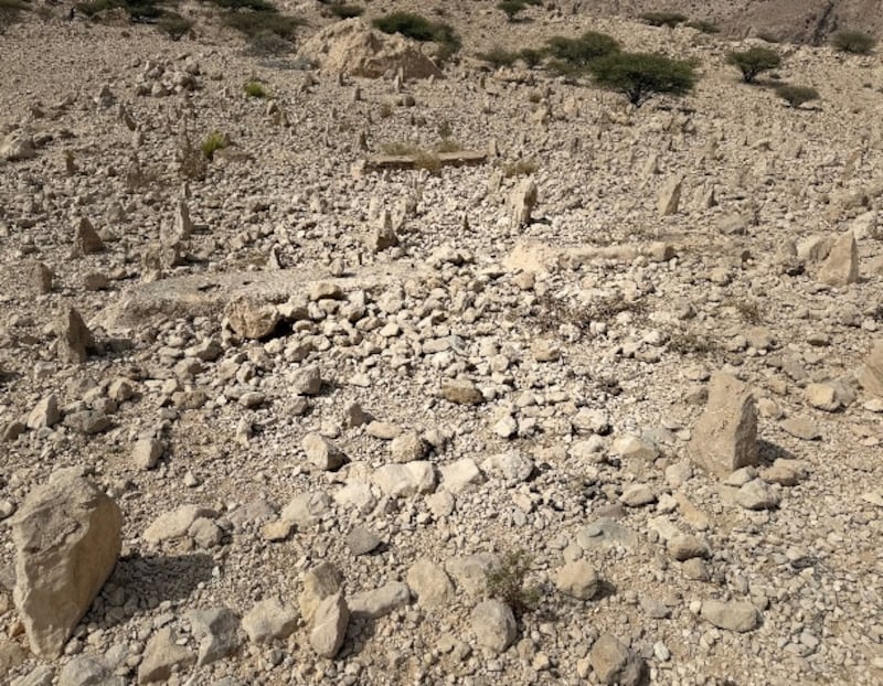 وهناك نوع ثالث من القبور في المقبرة ذاتها، لكنها قليلة العدد وهي تشبه إلى حد ما نمط القبور الركامية أو (قبور حضارة بات)، لكنها أصغر في الحجم والطول، وتتميز بوجود جدار حجري جاف (دون ملاط)، مبني من حجارة محلية متفاوتة الحجم، والجدار مرفوع على شكل مصطبة في منحدر جبلي.